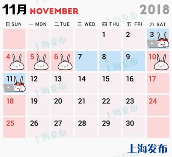 進口博覽會期間,上海將調(diào)整公眾休息日。11月5日(周一)調(diào)整為休息日,相應(yīng)將11月3日(周六)調(diào)整為工作日;將11月6日(周二)調(diào)整為休息日,相應(yīng)將11月11日(周日)調(diào)整為工作日。除保障進口博覽會舉辦、重大活動、城市運轉(zhuǎn)等必要的工作崗位外,本市機關(guān)、事業(yè)單位(包括學校)和社會團體按此執(zhí)行。證券交易機構(gòu)正常運行,不做調(diào)休。企業(yè)和其他單位可根據(jù)實際情況,自行安排。