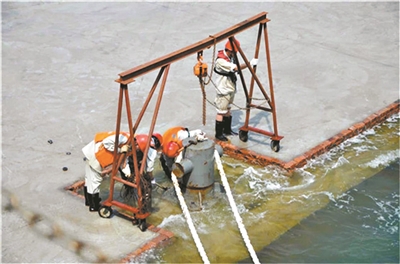 一節(jié)重約8萬(wàn)噸,相當(dāng)于一艘中型航母重量的標(biāo)準(zhǔn)沉管,在10艘大馬力拖輪的牽引及數(shù)十條警戒船護(hù)衛(wèi)下,浩浩蕩蕩駛往沉管安裝現(xiàn)場(chǎng)。和煦的春風(fēng)拂過(guò),溫暖的陽(yáng)光灑落在施工船面上忙碌的工人身上。在沉管浮運(yùn)途中,何志軍“爺孫仨”帶著工具走到“津安3”安裝船的甲板上,打量著沉管頂板上的纜樁!拔覀兊墓ぷ魇且粭l龍,管節(jié)浮動(dòng)前進(jìn)行二次舾裝,不僅要把沉管頂上的那些東西裝好,還要把管節(jié)里面的那些觀測(cè)設(shè)備、照明線路裝好,這些工作不能有半點(diǎn)馬虎;沉管浮運(yùn)到位后又要抓緊把管頂上該拆除的物件迅速拆除,以最短的時(shí)間完成沉放準(zhǔn)備;沉管安裝到位后,我們又把里面的那些管線、設(shè)備拆除……”雖然到項(xiàng)目工地上不久,何志軍介紹起工作來(lái)頭頭是道。