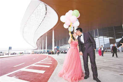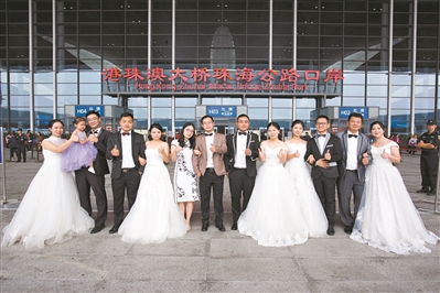 六對建設(shè)者夫妻回港珠澳大橋珠海公路口岸補(bǔ)拍婚紗照。