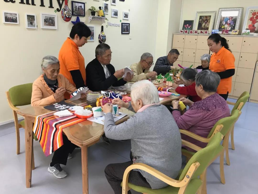 △二樓的老年人日間照護(hù)中心。8位年齡在79至92歲的老人正在做手工。習(xí)近平與他們一一握了手。(央視記者拍攝)