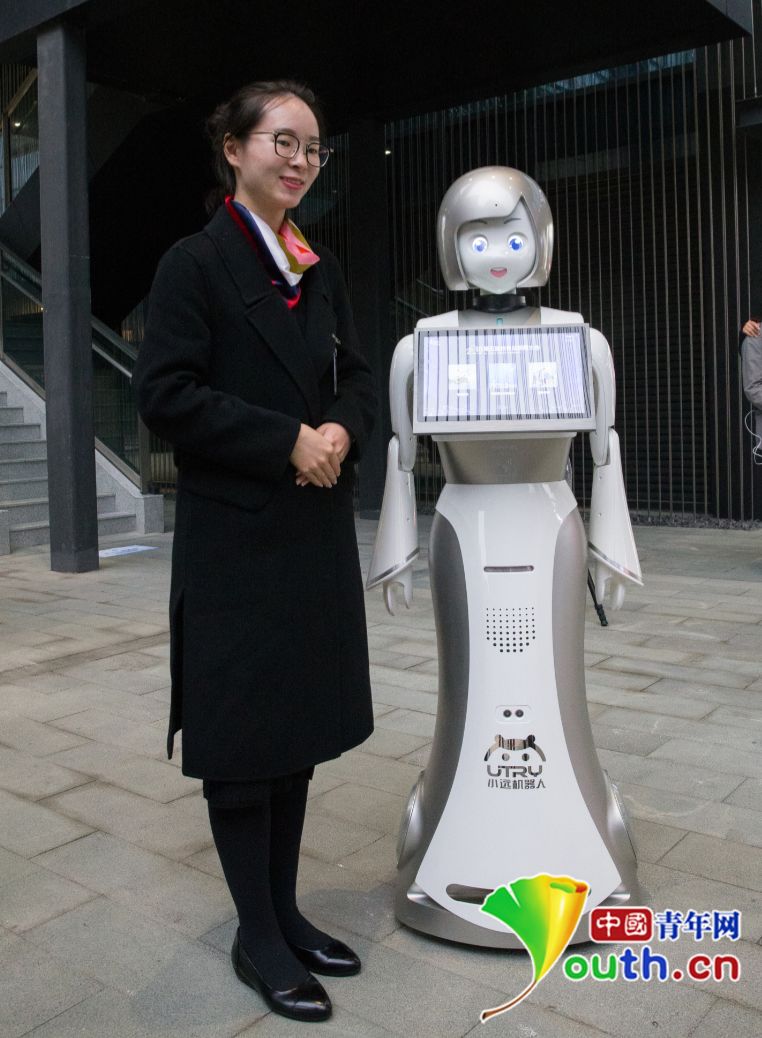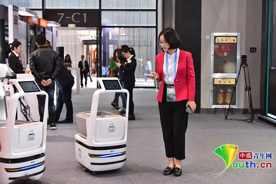來自浙江遠傳的智能機器人小遠在博覽會展廳門口為嘉賓提供導覽等服務。 中國青年網記者 宋繼祥 攝