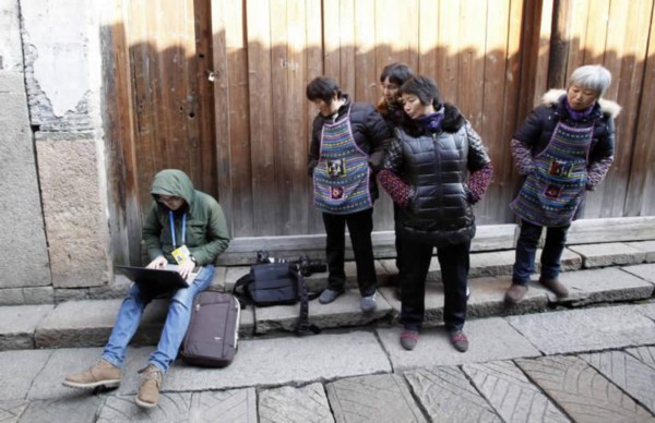 第二屆世界互聯(lián)網(wǎng)大會·烏鎮(zhèn)峰會期間,上海新民網(wǎng)記者蕭君瑋坐在老街上,用最快的速度在線發(fā)布最新消息。趙穎碩 攝
