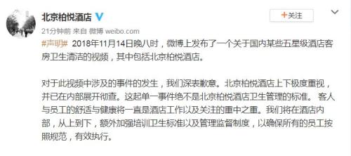 對于視頻中涉及的事件的發(fā)生,北京柏悅酒店表示深表歉意,酒店上下極度重視,并已在內(nèi)部展開徹查。