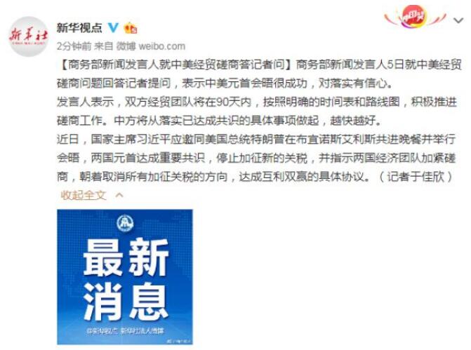 商務(wù)部新聞發(fā)言人5日就中美經(jīng)貿(mào)磋商問題回答記者提問,表示中美元首會(huì)晤很成功,對落實(shí)有信心。