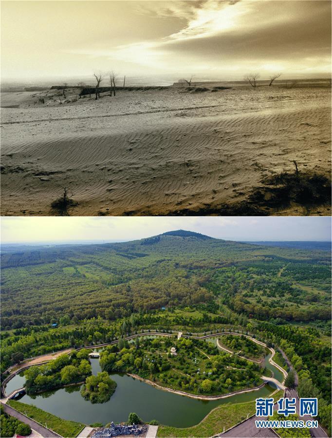 拼版照片:上圖為治理前,山西朔州市右玉縣的荒涼沙地(資料照片);下圖為右玉縣小南山森林公園(新華社記者曹陽8月7日攝)。右玉縣林木綠化率從1976年的12.66%增至2017年的54%,在黃土高原上樹起一道綠色豐碑。新華社發(fā)