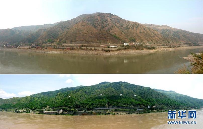 這張拼版圖片是實施天然林保護工程前后的四川攀枝花市三堆子人工造林區(qū)(上圖攝于1998年,下圖攝于2008年)。這里是全國天然林保護工程發(fā)源地。新華社發(fā)