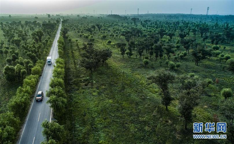 汽車行駛在陜西榆林市靖邊縣東坑鎮(zhèn)新建村的道路上(8月1日無人機拍攝)。陜西省開展的天然林保護工程和全面治理荒沙行動,極大改善了毛烏素的生態(tài)環(huán)境,也使沙漠南緣的陜西省榆林市實現(xiàn)從“沙進人退”到“綠進沙退”的轉(zhuǎn)變。新華社記者 陶明 攝
