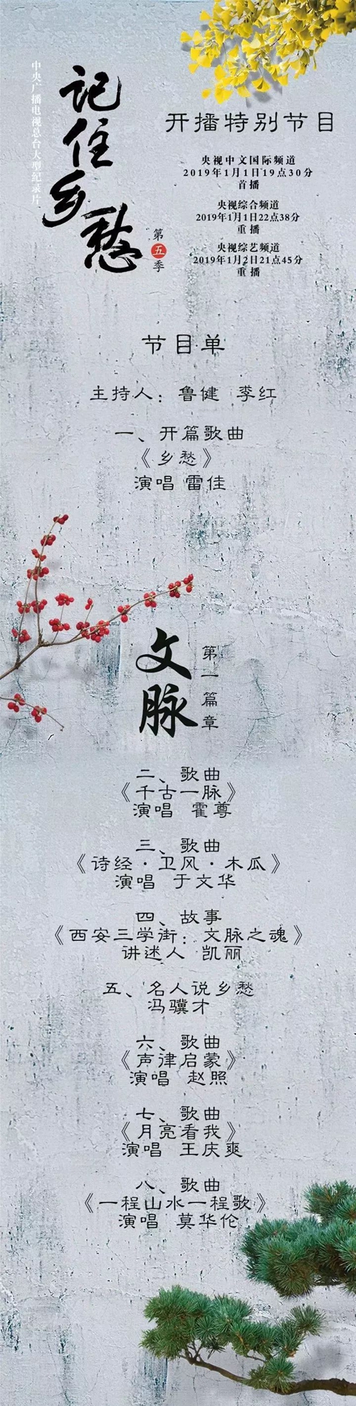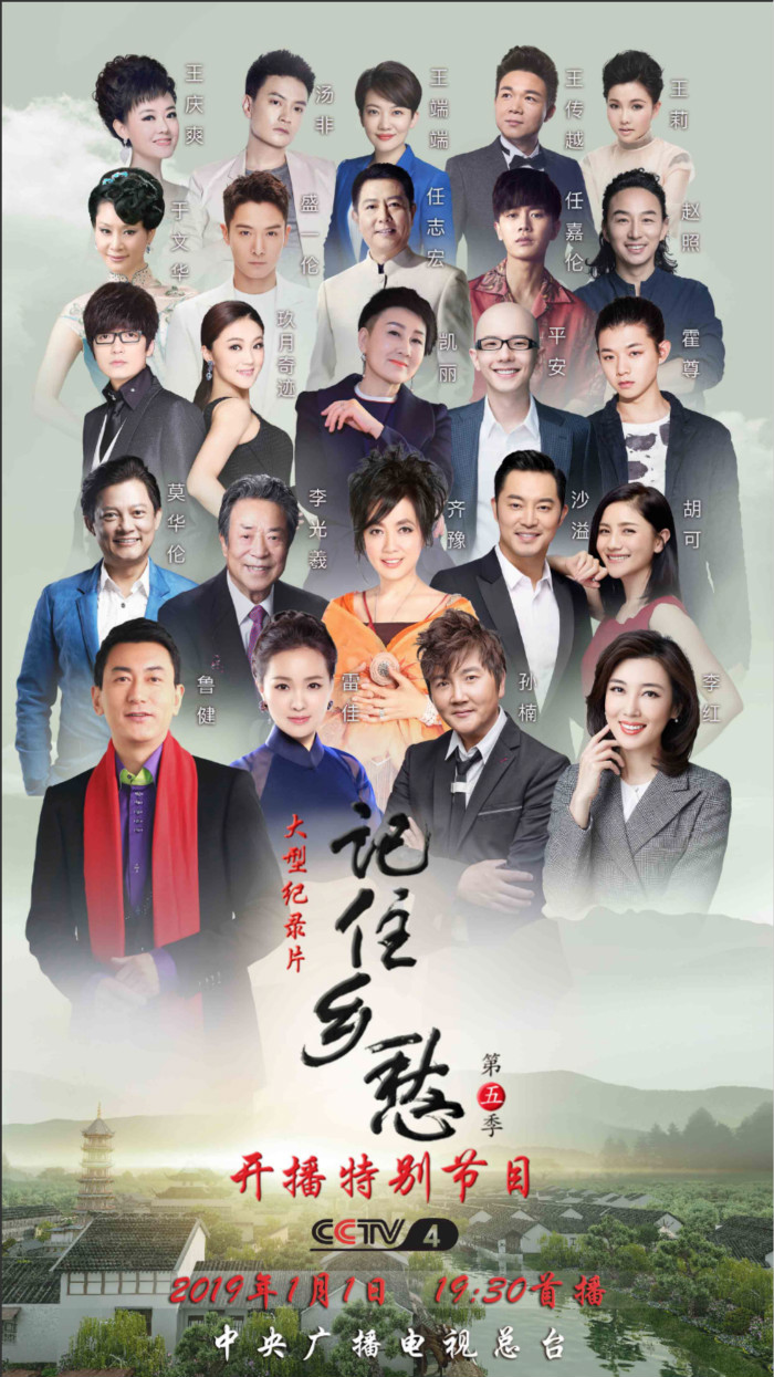 大型紀(jì)錄片《記住鄉(xiāng)愁》第五季開播特別節(jié)目,將于2019年1月1日19:30在中央廣播電視總臺中文國際頻道首播。22:38在綜合頻道重播,1月2日21:45在綜藝頻道重播。