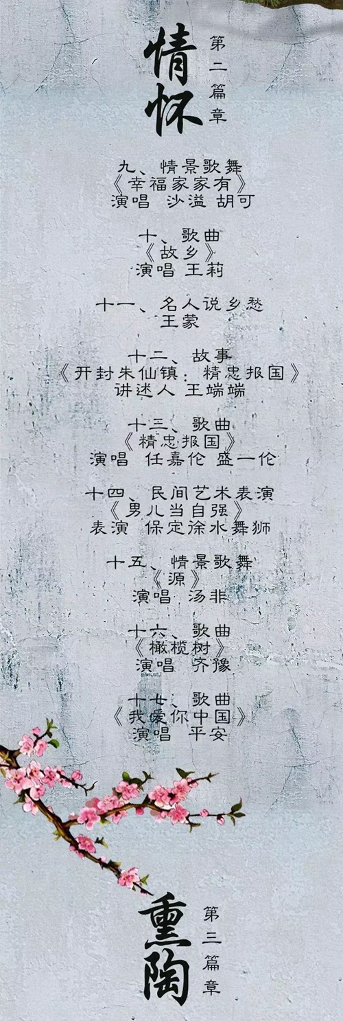 《記住鄉(xiāng)愁》第五季開播特別節(jié)目以“文脈”、“情懷”、“熏陶”為篇章,展現(xiàn)中國傳統(tǒng)意蘊(yùn)之美、豐厚的文化底蘊(yùn)與濃郁的家國情懷。眾多知名藝術(shù)家傾情參與,演繹出對故鄉(xiāng)的思念,致敬中華優(yōu)秀傳統(tǒng)文化。