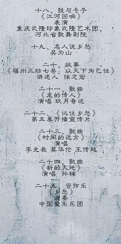 2019年元旦,中央廣播電視總臺“大型紀(jì)錄片《記住鄉(xiāng)愁》第五季開播特別節(jié)目”將在央視中文國際頻道、綜合頻道、綜藝頻道播出,精心打造的開播特別節(jié)目,用豐富的表現(xiàn)形式,濃縮了傳承千年的故土鄉(xiāng)情,唱響了新時代的拳拳鄉(xiāng)愁。晚會洋溢著溫暖與感動、幸福與憧憬、豪邁與激情,藝術(shù)地詮釋了中國人獨有的鄉(xiāng)愁內(nèi)涵。