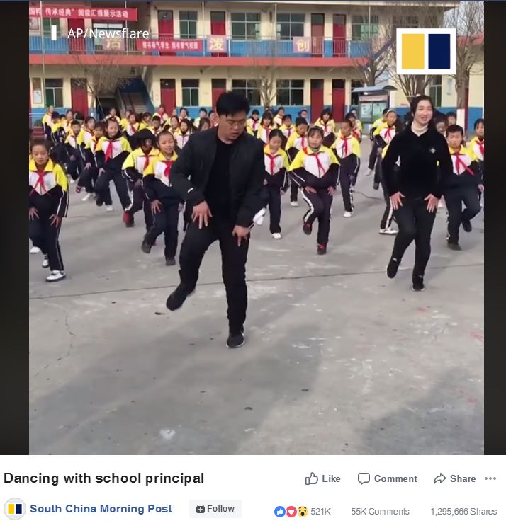 《每日郵報(bào)》介紹稱,張鵬飛校長(zhǎng)去年夏天在一個(gè)廣場(chǎng)上看到很多人跳“鬼步舞”,就決定自學(xué)這種舞蹈!拔矣X得這個(gè)舞蹈非常適合現(xiàn)在的孩子”,張校長(zhǎng)說,“鬼步舞音樂活潑有力,節(jié)奏動(dòng)感十足,讓人覺得非?鞓!