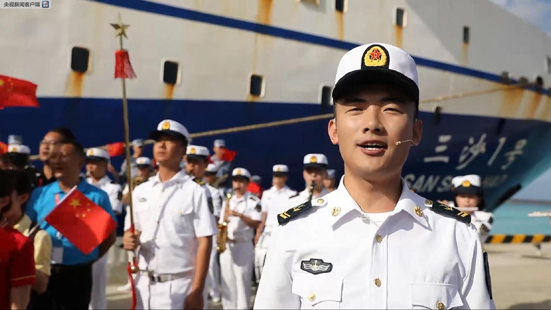 “我和我的祖國,一刻也不能分割。無論我走到哪里,都流出一首贊歌!比澈\姂(zhàn)士李宗霖領(lǐng)唱歌曲。接著,三沙駐島戰(zhàn)士從遠(yuǎn)處走來,齊聲高歌,意氣風(fēng)發(fā)、豪情滿懷地歌唱,表達(dá)了對祖國的眷眷深情。