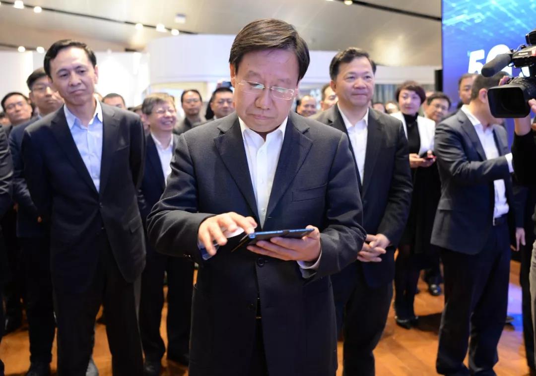 △中宣部常務(wù)副部長王曉暉(中)通過華為5G折疊手機進行4K節(jié)目投屏操作