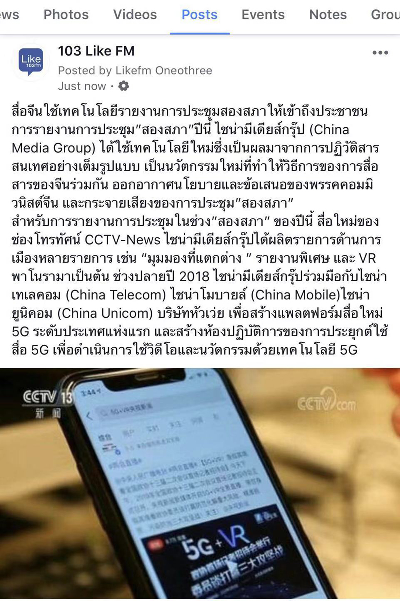 △泰國Like FM103電臺“臉書”轉發(fā)總臺泰語報道