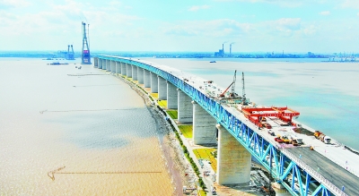 改革開放以來,中國從橋梁大國邁向橋梁強(qiáng)國。圖為滬通長江大橋施工現(xiàn)場。新華社發(fā)