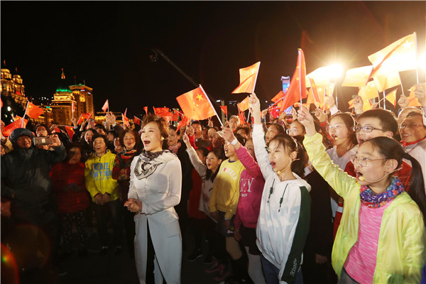 昆曲藝術(shù)家張軍、新聞主播葉蓉、和平飯店爵士樂隊、黃浦區(qū)勞模代表、春天少年合唱團的少年們……出人意料地閃現(xiàn)在人流如梭的外灘,用不同的方式唱響《我和我的祖國》。外灘成了一片紅色的歡樂海洋:輪滑少年手執(zhí)國旗在人群前滑過,江邊和浦江游輪上的人們興奮地互相舞動著國旗,鐘樓在燈光投射下“身披”一面巨型國旗……越來越多的游人圍聚過來跟著一起高歌,人們拿出手機記錄下這一特別的時刻。歌曲結(jié)束時,歡呼聲響徹外灘!拔覑壑袊,我愛上!,孩子們?nèi)杠S高呼。