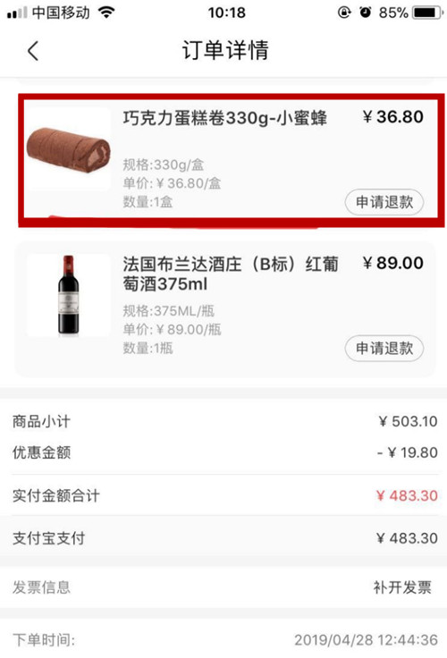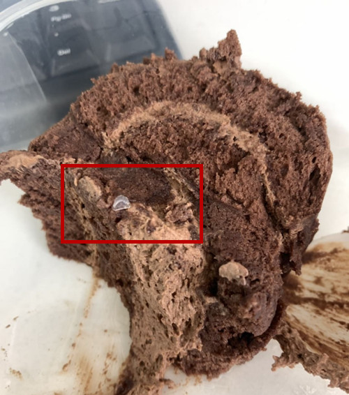 “這份巧克力卷是我28日通過盒馬APP下單的,想當(dāng)做早餐食用。在29日上午吃到第二口時,發(fā)現(xiàn)蛋糕上附著著一塊異物,仔細(xì)一看是一塊疑似玻璃材質(zhì)的小碎片!蓖跖糠Q。