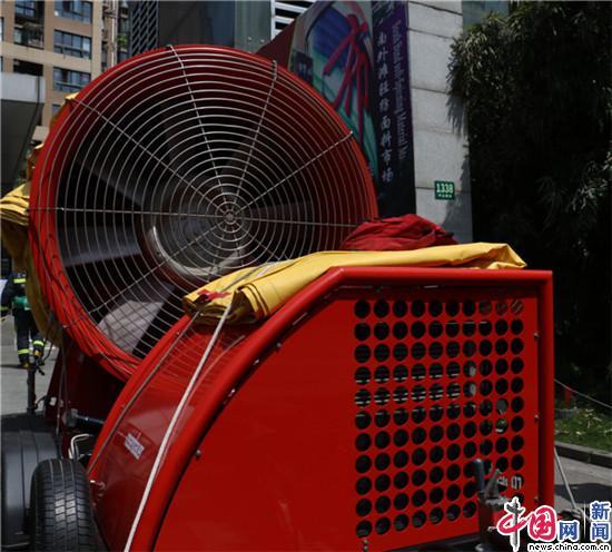 連接著坑道正壓送風機的是一條巨大的黃色軟管,多名消防員拉著管口,向地鐵內(nèi)送風。記者了解到,由于地鐵內(nèi)通道很多,機器送風效果不明顯,車站中隊特地定制了這款送風軟管,最長可延展到100米,顯著增強送風效果。