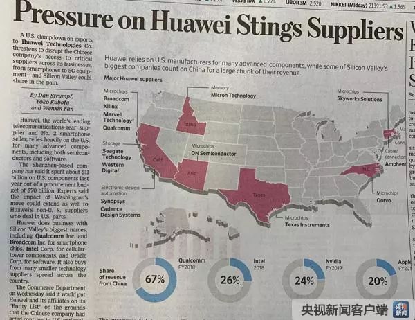 這樣的“突變”,恰恰揭示出美國政府逆潮流而動的不得人心!度A爾街日報》刊發(fā)《施壓華為,刺痛供應(yīng)商》,文章說,美國政府出臺政策限制向華為公司出口零部件和技術(shù),美國硅谷也將因此受損,因為華為與硅谷的大公司都有生意往來,如從高通和博通購買芯片,從英特爾購買無線發(fā)射塔部件,從甲骨文購買軟件,同時還從美國各地的小型技術(shù)公司采購,等等。文章還以一幅圖示表明,從2018年的年報來看,這些公司相當(dāng)一部分的收入來自中國。高通67%,英特爾26%,英偉達(dá)24%,蘋果20%。