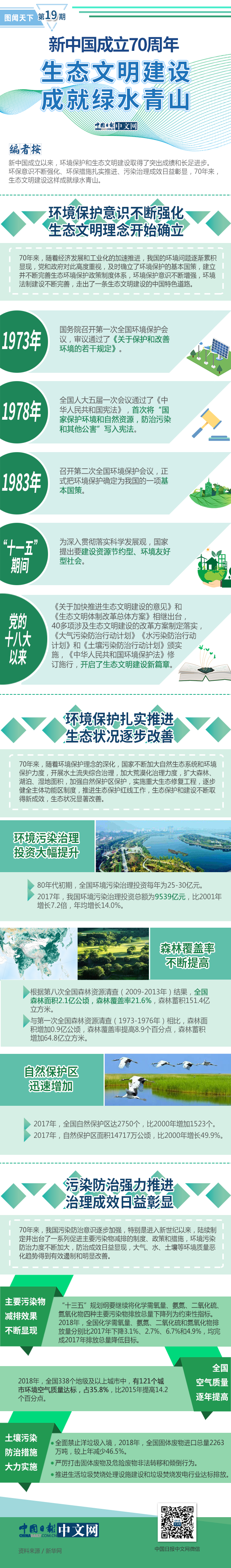 新中國成立以來,環(huán)境保護和生態(tài)文明建設(shè)取得了突出成績和長足進步。環(huán)保意識不斷強化、環(huán)保措施扎實推進、污染治理成效日益彰顯,70年來,生態(tài)文明建設(shè)這樣成就綠水青山。