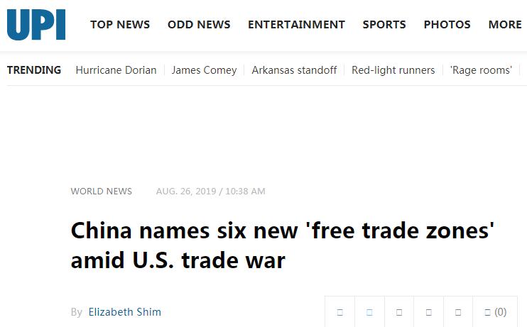 美國合眾國際社(UPI)26日報道稱,在中美貿(mào)易戰(zhàn)愈演愈烈的背景下,中國宣布設(shè)立六個新的自貿(mào)試驗區(qū)。這顯示了中國進一步促進貨物和投資自由流動的意愿和決心。