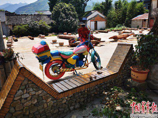 但在這個(gè)相傳已有千余年歷史的村莊,它是第一件被外人稱為“藝術(shù)品”的公共設(shè)施。為了裝飾它,村民還拉來(lái)了一輛早已報(bào)廢的摩托車,用油漆把它涂得五彩斑斕,擺在椅子旁邊。