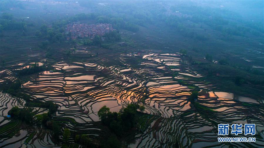 這是在云南省元陽縣拍攝的傍晚時分的哈尼梯田美景(2019年4月3日無人機拍攝)。 新華社記者 胡超 攝