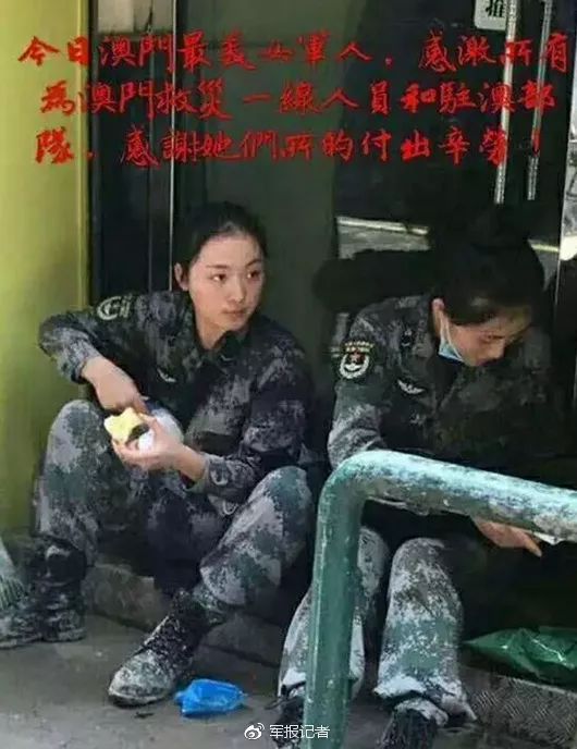 在那場(chǎng)救援中,駐澳門(mén)部隊(duì)女兵管劉寒和裴瑩意外成了“網(wǎng)紅”——她們?cè)诰仍g隙坐在路邊休息的照片,在那一年成了網(wǎng)絡(luò)熱搜,許多人稱贊她們是“澳門(mén)最美女兵”。