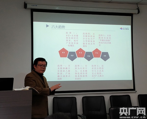 主編林小勇教授介紹《未來媒體藍皮書:中國未來媒體研究報告(2019)》(央廣網(wǎng)記者 劉揚濤 攝)