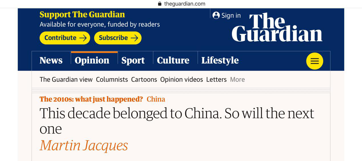 近日,以嚴(yán)肅獨(dú)立著稱的英國三大報(bào)之一的《衛(wèi)報(bào)》在其官網(wǎng)刊發(fā)了英國劍橋大學(xué)高級(jí)研究員馬丁·雅克(Martin Jacques)的文章:《過去十年屬于中國,未來十年也將如此》(This decade belonged to China. So will the next one)。文章指出,在過去十年里,全球經(jīng)濟(jì)增長(zhǎng)的主要源泉一直是中國而非美國。同樣未來十年,中國在全球的影響力將與日俱增。