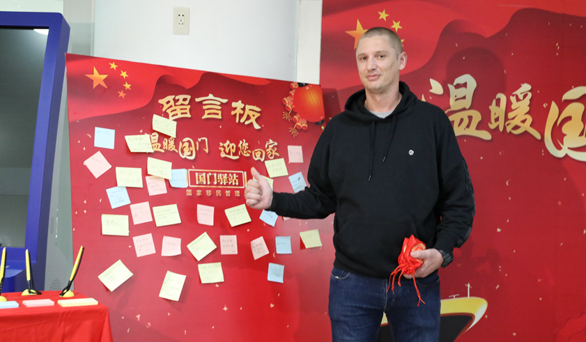 得知自己在中國新年即將來臨之際成為幸運旅客后,特拉維斯先生感到既意外又興奮。在邊檢民警的引導(dǎo)下,他順著指示牌來到144小時過境免簽辦理柜臺,邊檢民警進行必要的詢問后,快速為其簽發(fā)了臨時入境許可。隨后,他來到入境外國人檢查通道,順利通過入境檢查。