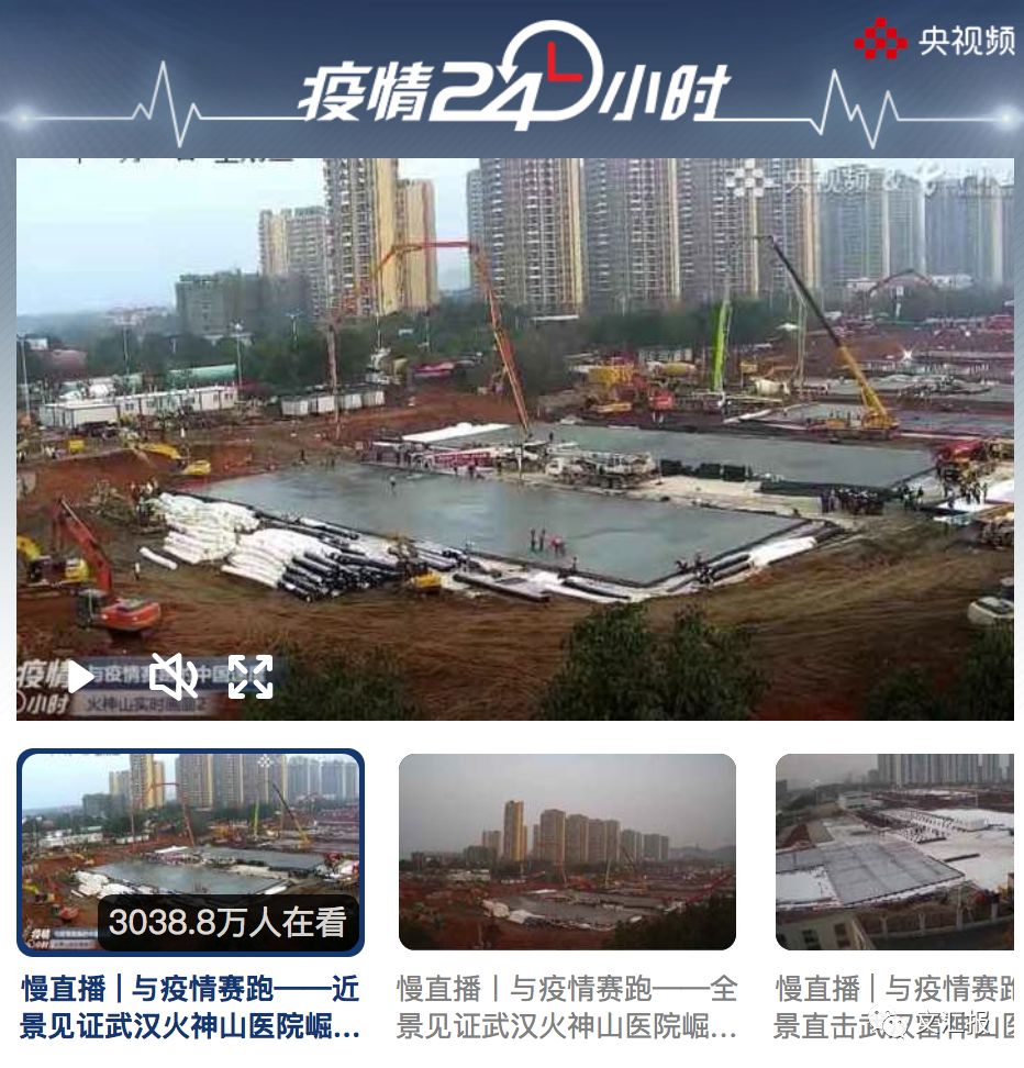 央視頻在火神山、雷神山醫(yī)院施工現(xiàn)場(chǎng)的24小時(shí)滾動(dòng)直播。