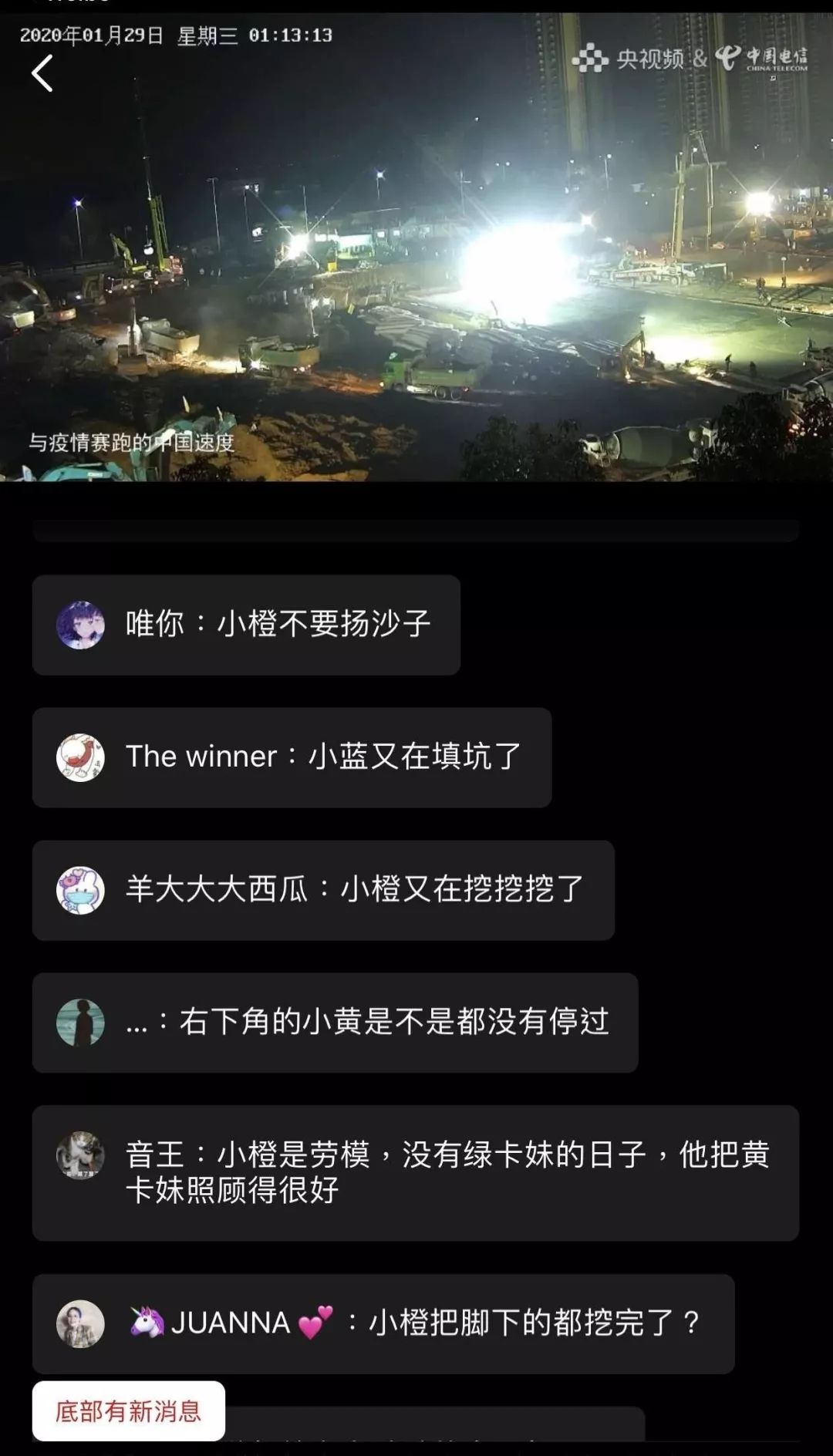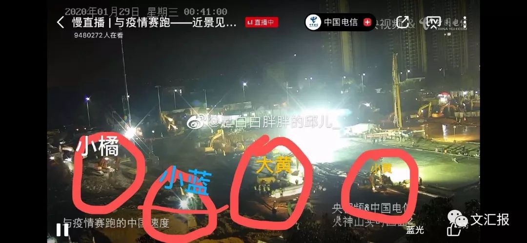 道光帝——道路拋光機(jī)焊武帝——電焊工作組攝政王——攝像頭勤史黃——畫面左下角的黃色挖掘機(jī),似乎因?yàn)榭拷肟谏瞎ぬ貏e早被稱為勤史黃。吳三桂——火神山最下面三棵桂樹,雖然總是擋住大家視線,但是考慮到他能為攝政王擋風(fēng)就原諒他們了。
