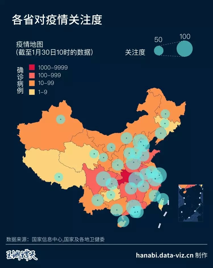 在這張圖上,你同時(shí)還能看到一個(gè)指標(biāo),就是各地民眾對(duì)疫情的關(guān)注程度,疫源地湖北、人口稠密區(qū)北上廣、最先啟動(dòng)一級(jí)響應(yīng)的浙江、“硬核防疫”的河南,都密切關(guān)注著這場(chǎng)疫情。
