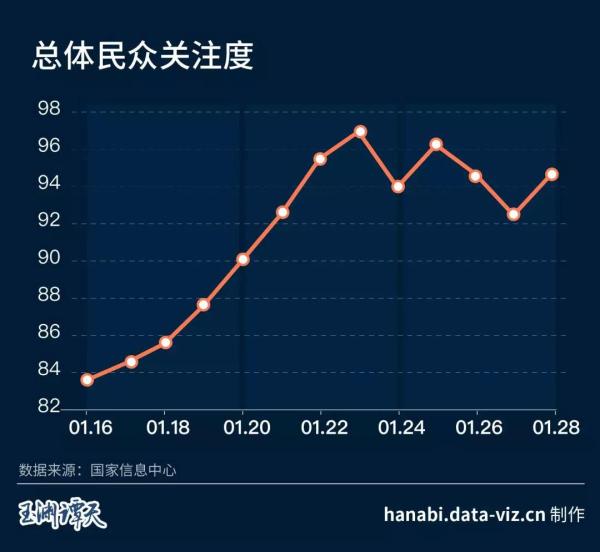 隨著當(dāng)天習(xí)近平總書(shū)記親自指揮、親自部署,民眾關(guān)注度快速增長(zhǎng)。23日武漢宣布關(guān)閉所有離漢通道,民眾關(guān)注度攀升頂峰達(dá)96.95。