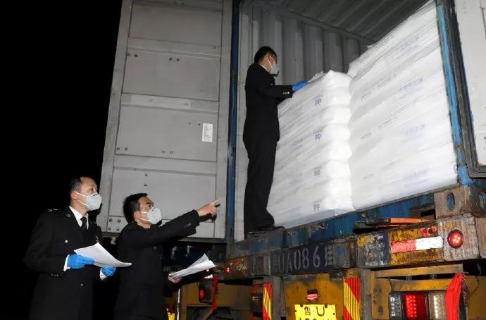 2月1日凌晨1時許,8輛滿載疫情防控物資生產(chǎn)原料的集裝箱貨車駛?cè)胧仪f綜合保稅區(qū)主卡口。石家莊海關(guān)所屬正定海關(guān)的關(guān)員們早已等候在卡口,他們立即對貨物進行消毒、驗放,僅15分鐘就完成了全部驗放流程。這批貨物總重192噸,為企業(yè)生產(chǎn)輸液袋的原材料,這是石家莊海關(guān)監(jiān)管的首票進口疫情防控通關(guān)物資。