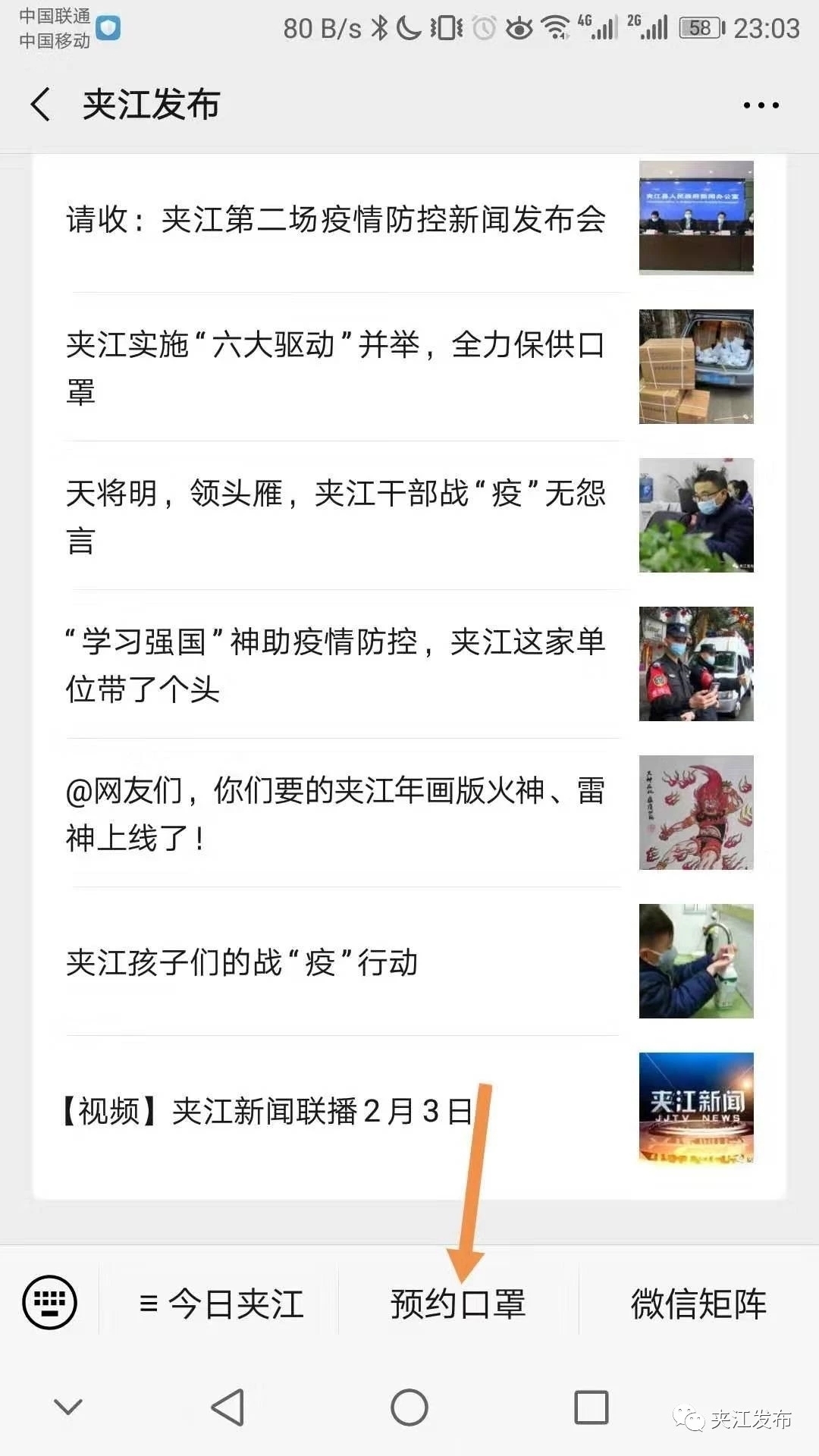 從2020年2月6日上午9時(shí)開始,廣大市民可以通過關(guān)注 “夾江發(fā)布”微信公眾號(hào),點(diǎn)擊下方“預(yù)約口罩”菜單進(jìn)行預(yù)約。若預(yù)約成功每個(gè)市民每次可以購(gòu)買2個(gè)口罩。每天定量銷售,售完為止。同一個(gè)微信號(hào)每三天內(nèi)只能預(yù)約一次。
