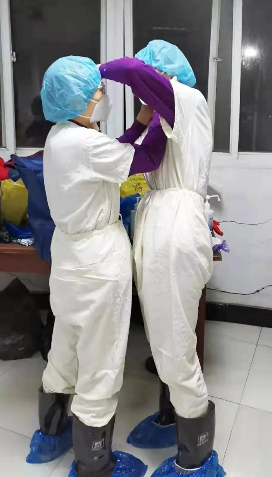 趙悅(左)和同事互相協(xié)作穿戴防護裝備。
