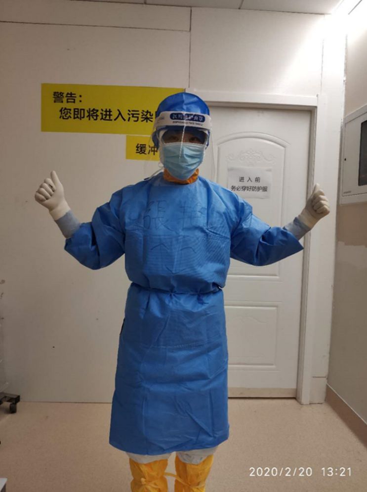 穿脫防護(hù)服是上下班最繁瑣、最重要的環(huán)節(jié),稍有不慎很容易被感染。張艷特別細(xì)心,對于年輕的護(hù)士,她總是熱心地幫助大家,看看合不合身、整理護(hù)目鏡、涂抹碘伏、查看密封性、寫上祝福語……她說:“我們都是一起出征的戰(zhàn)友,照顧好病患的同時,我們也要做好自身防護(hù),大家都要平平安安來,安安全全回,我們一個都不能少!”戰(zhàn)友們都調(diào)侃地叫她“張媽”。