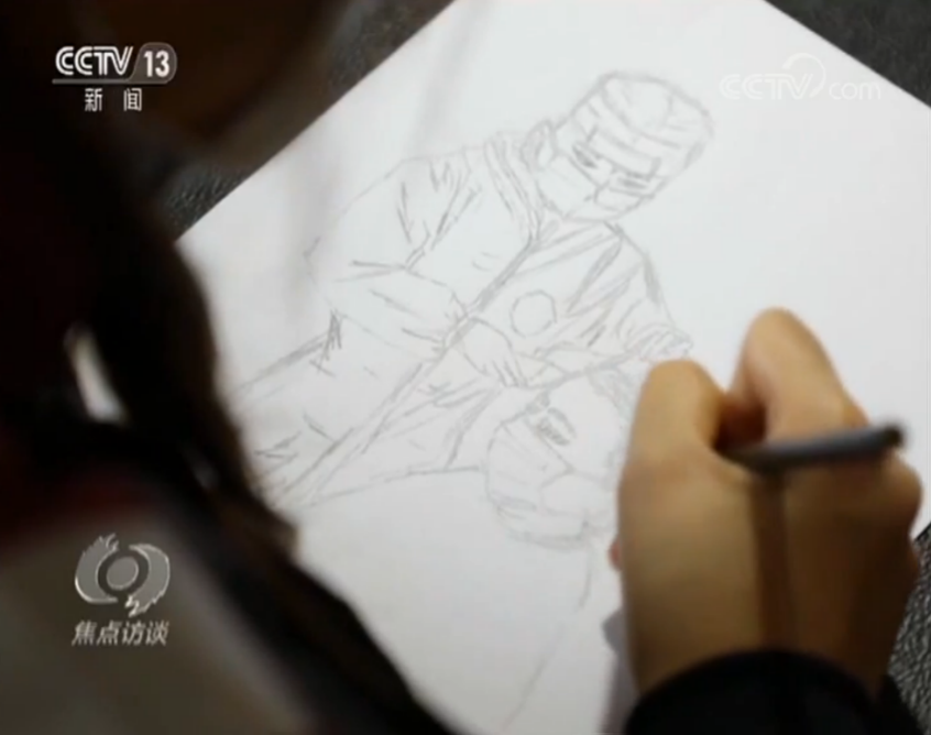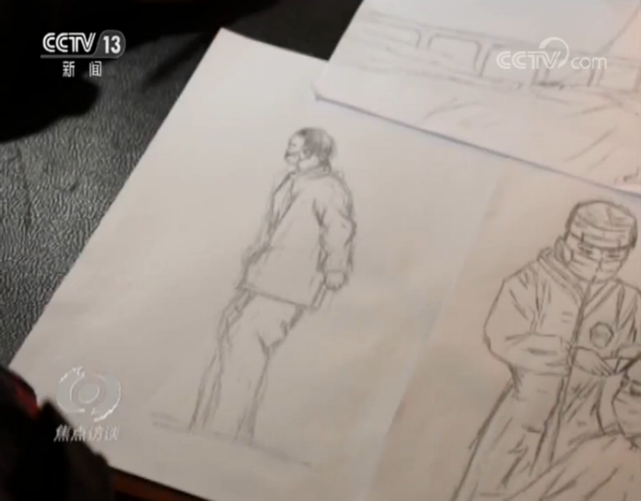 在孟凡瑩的畫(huà)里,不僅有與她一起并肩戰(zhàn)斗的同事,還有一位她并不熟悉的人,“他是酒店的一個(gè)工作人員,每天都在陪著我們!币?yàn)橛洸磺暹@位酒店工作人員的長(zhǎng)相,孟凡瑩只畫(huà)出了一個(gè)側(cè)影。