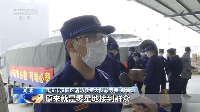 武漢市漢陽區(qū)消防救援大隊教導(dǎo)員 鄭燦燦:原來就是零星地接到群眾通過119打電話過來,要求我們幫忙送一些生活方面的物資。后來隨著量的增大,我們就跟社區(qū)聯(lián)系,由他們集中統(tǒng)一匯總一下,我們統(tǒng)一集中進(jìn)行配送。