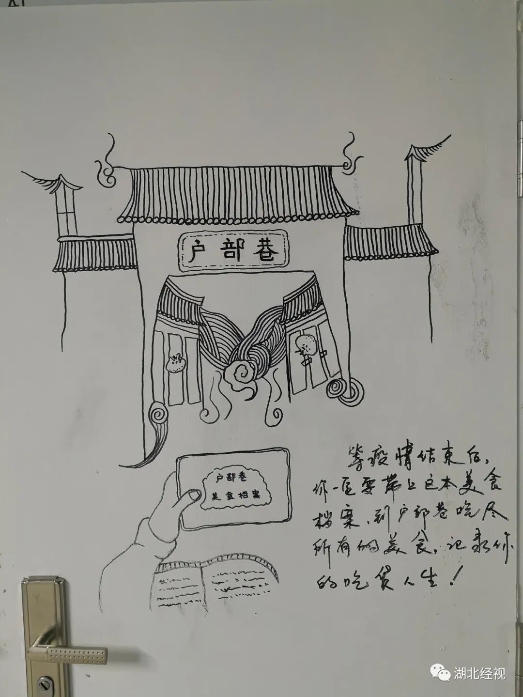 除此之外墻上還有武漢的戶部巷、黃鶴樓“等疫情結(jié)束后你一定要帶上這本美食檔案到戶部巷吃盡所有美食......”