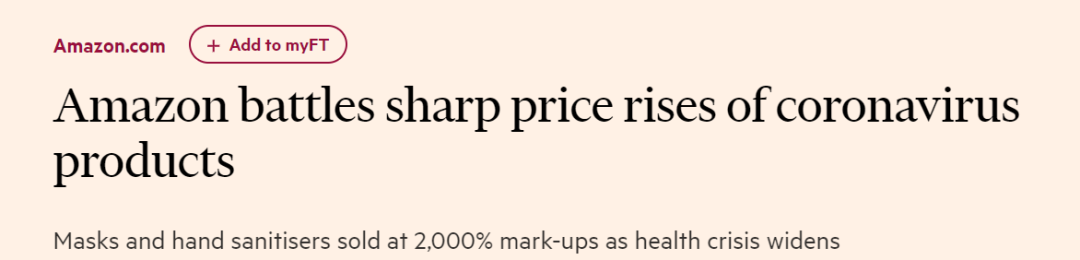 《金融時(shí)報(bào)》3月3日?qǐng)?bào)道稱,在亞馬遜網(wǎng)站上,有些商家甚至將免洗洗手液和口罩的價(jià)格提升至日常零售價(jià)的2000%。