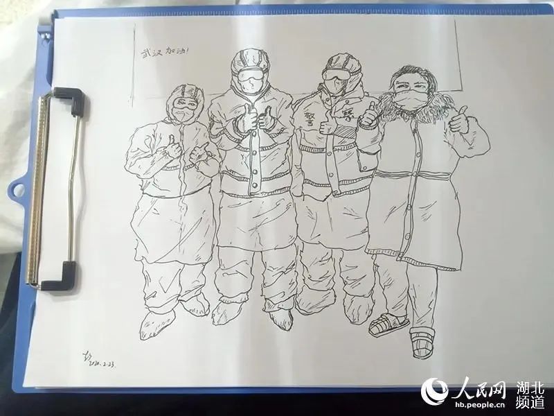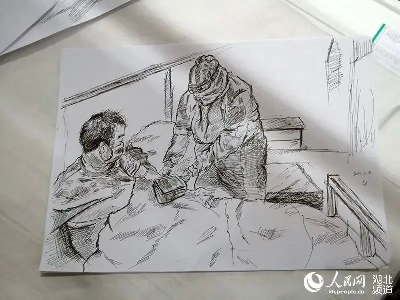 將方艙醫(yī)院溫暖的瞬間畫成素描。