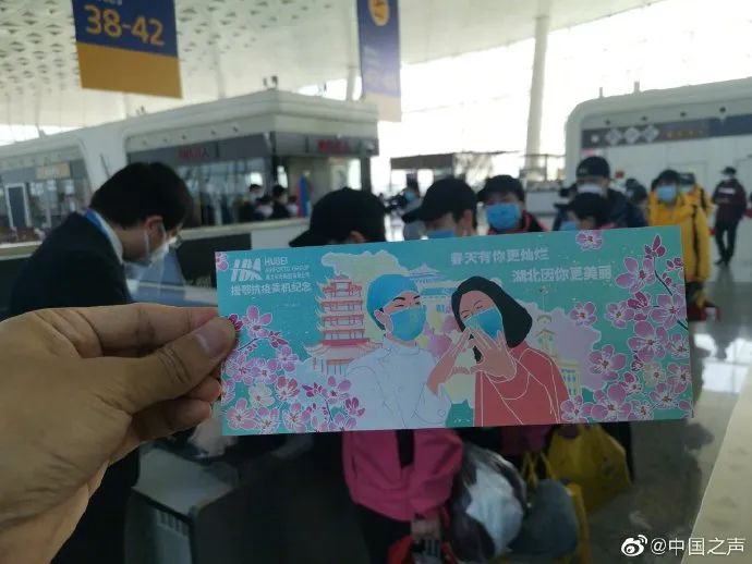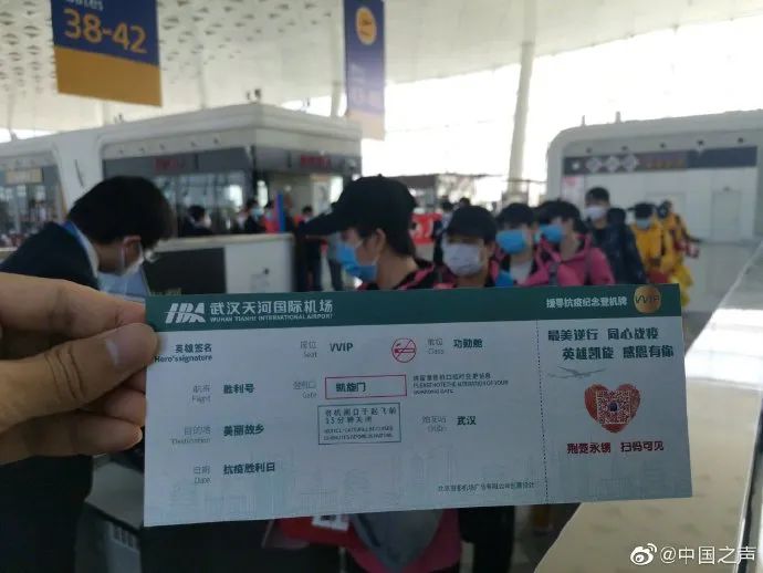 3月17日,在武漢天河機(jī)場(chǎng)登機(jī)口,新疆第二批援漢醫(yī)療隊(duì)正在登機(jī),她們得到了一張?zhí)厥獾牡菣C(jī)牌, 登機(jī)口是“凱旋門”,航班是“勝利號(hào)”,目的地是“美麗故鄉(xiāng)” 。此外,她們還隨身攜帶 武漢熱干面 來回憶這個(gè)春天的武漢味道。