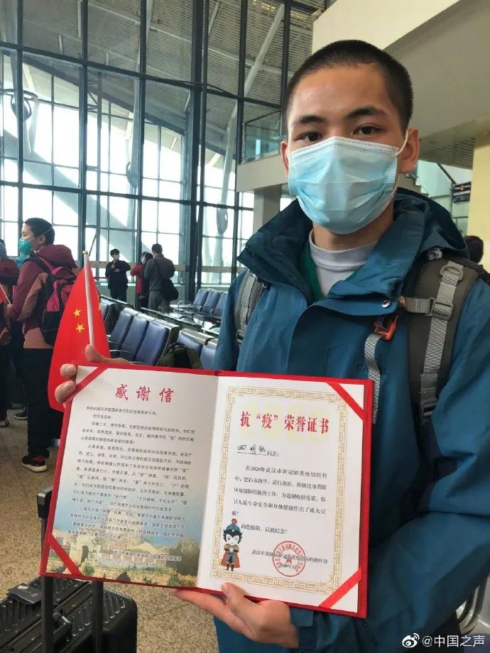 田明超,是湖南第八批支援湖北醫(yī)療隊(duì)中年齡最小的隊(duì)員。他是一名呼吸與重癥科護(hù)士,2月15日馳援武漢,一直在黃陂方艙醫(yī)院。候車時(shí),他的背包后插著國(guó)旗,手里還拿著一面國(guó)旗和一本榮譽(yù)證書。他說,時(shí)間不長(zhǎng),收獲巨大,是人生重要經(jīng)歷。拿到榮譽(yù)證書很興奮,舍不得放包里;手持國(guó)旗,是要和祖國(guó)在一起!