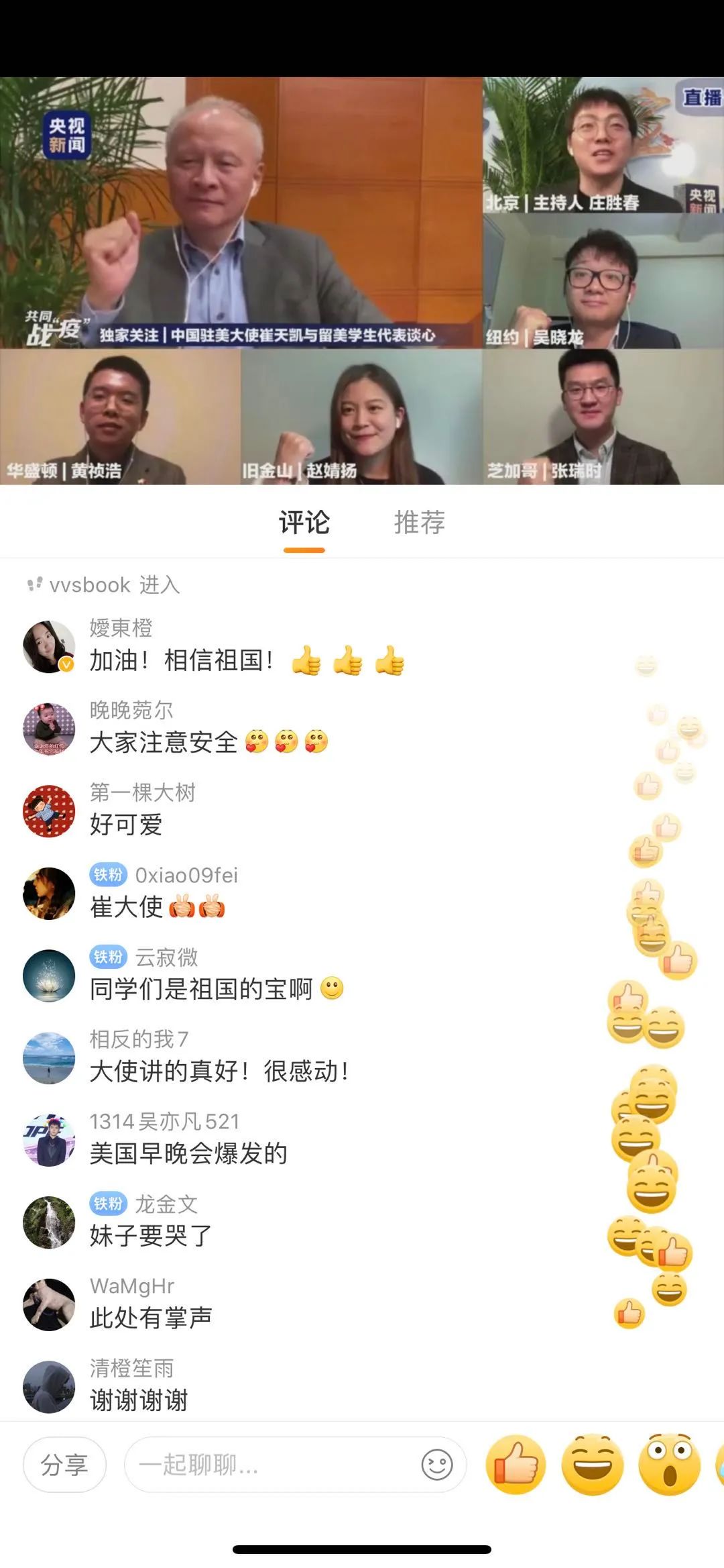 在直播的最后,崔天凱大使表示,無論美國疫情形勢如何發(fā)展,“只要同學(xué)們在,只要中國同胞還在,大使館不會撤退,我不會離開。我們一定會堅守崗位,和大家共克時艱,一起迎接最后的勝利!”