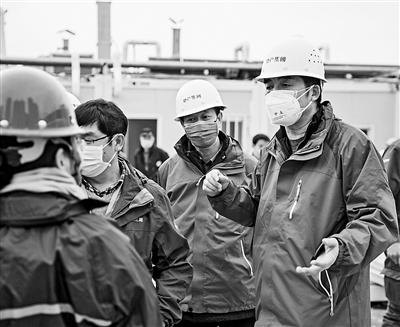 付明貴(右一)在雷神山醫(yī)院建設(shè)現(xiàn)場(chǎng)指揮調(diào)度。作者供圖