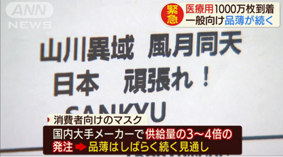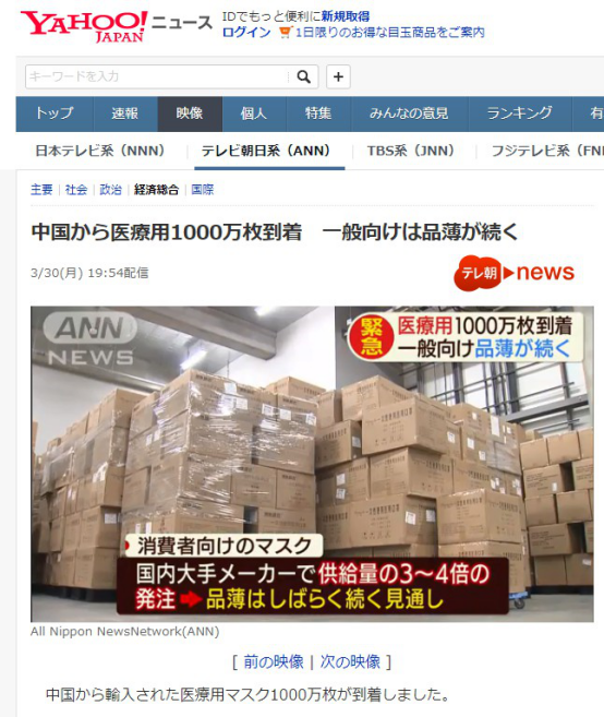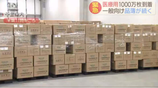 在這則名為《從中國來的一千萬枚醫(yī)療專用(口罩)運到,但民間用品仍在短缺中》的新聞,報道了中國來的大約1,000萬枚口罩已經(jīng)到達日本的千葉縣,不日將配送給各都道府縣的醫(yī)療機構(gòu)。這讓面對疫情萬分緊張的日本民眾多少松了口氣。