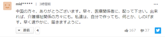 中國的各位,多謝了!請盡快發(fā)放給醫(yī)療人員吧。如果有可能,也給福利院的各位發(fā)一些吧。我們呢,或者自己做,或者……總之努力忍耐吧。快一點送去吧!
